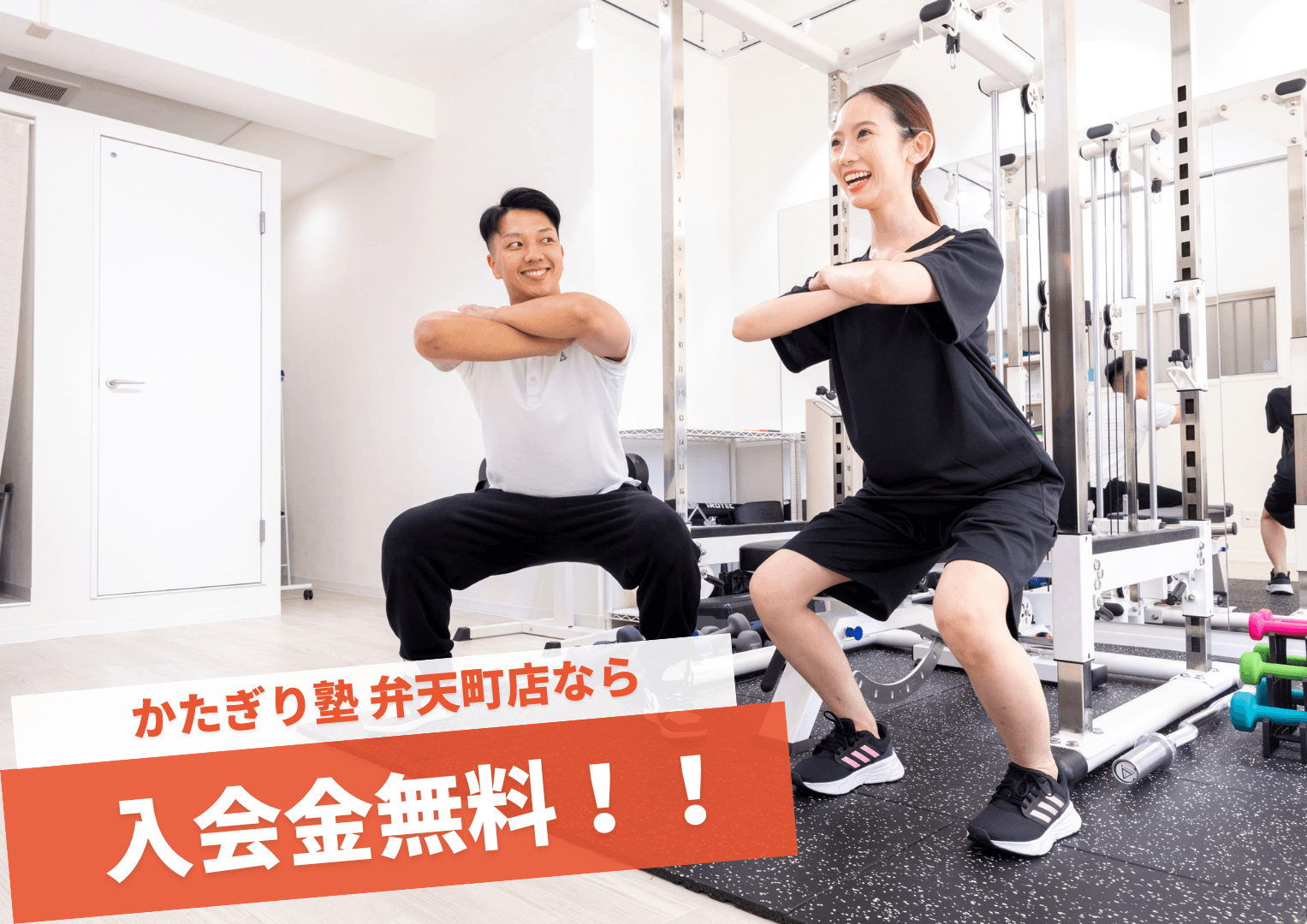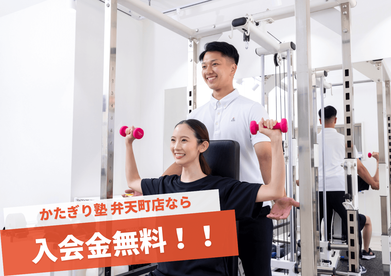 かたぎり塾 弁天町店では、体験パーソナルトレーニング(60分)を無料で受けることができます。そこでは、実際に通われている方と同じく、パーソナルトレーナーがあなたの体質や目標を測定・ヒアリングし、あなただけのメニューでエクササイズをしていただけます。