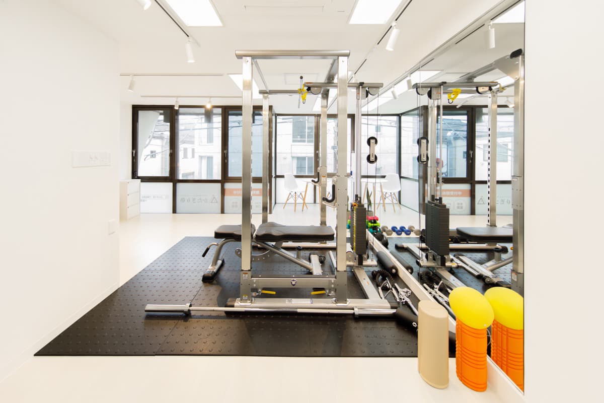 白を基調とした店舗は、一面ガラス張りの設計で陽の光が気持ちよくふりそそぎます。もちろん貸切ですので、贅沢に洗練された空間を独り占めしていただけます!人目が気になる方や、個別指導で集中したい方が、安心してダイエットやボディメイク・健康維持に役立てていただける環境です。