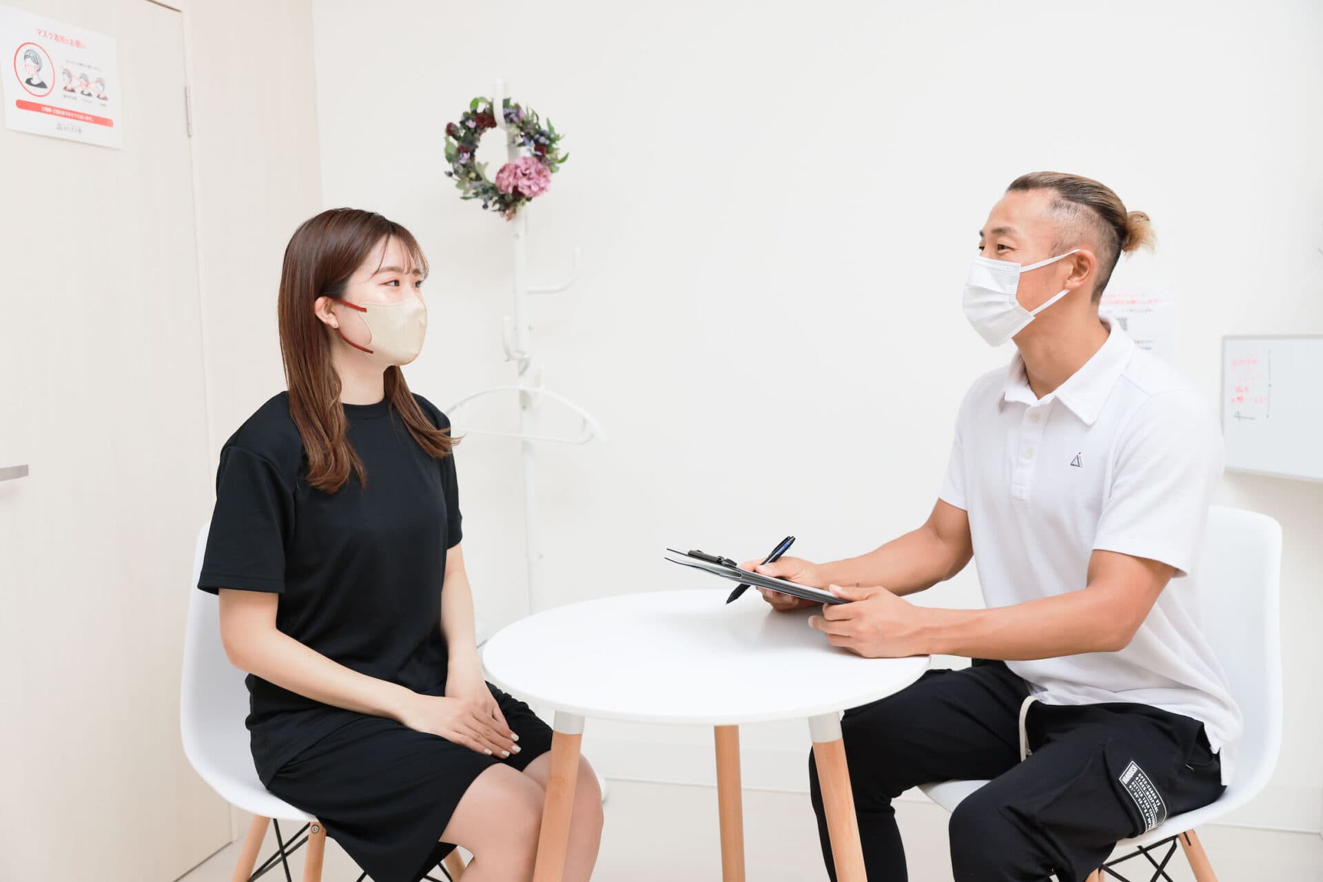 まずは体組成計で体脂肪率・筋肉量をチェックしカウンセリングへ。身体で気になっている部位、どのような理想をもっているかなど、何でもご相談ください。