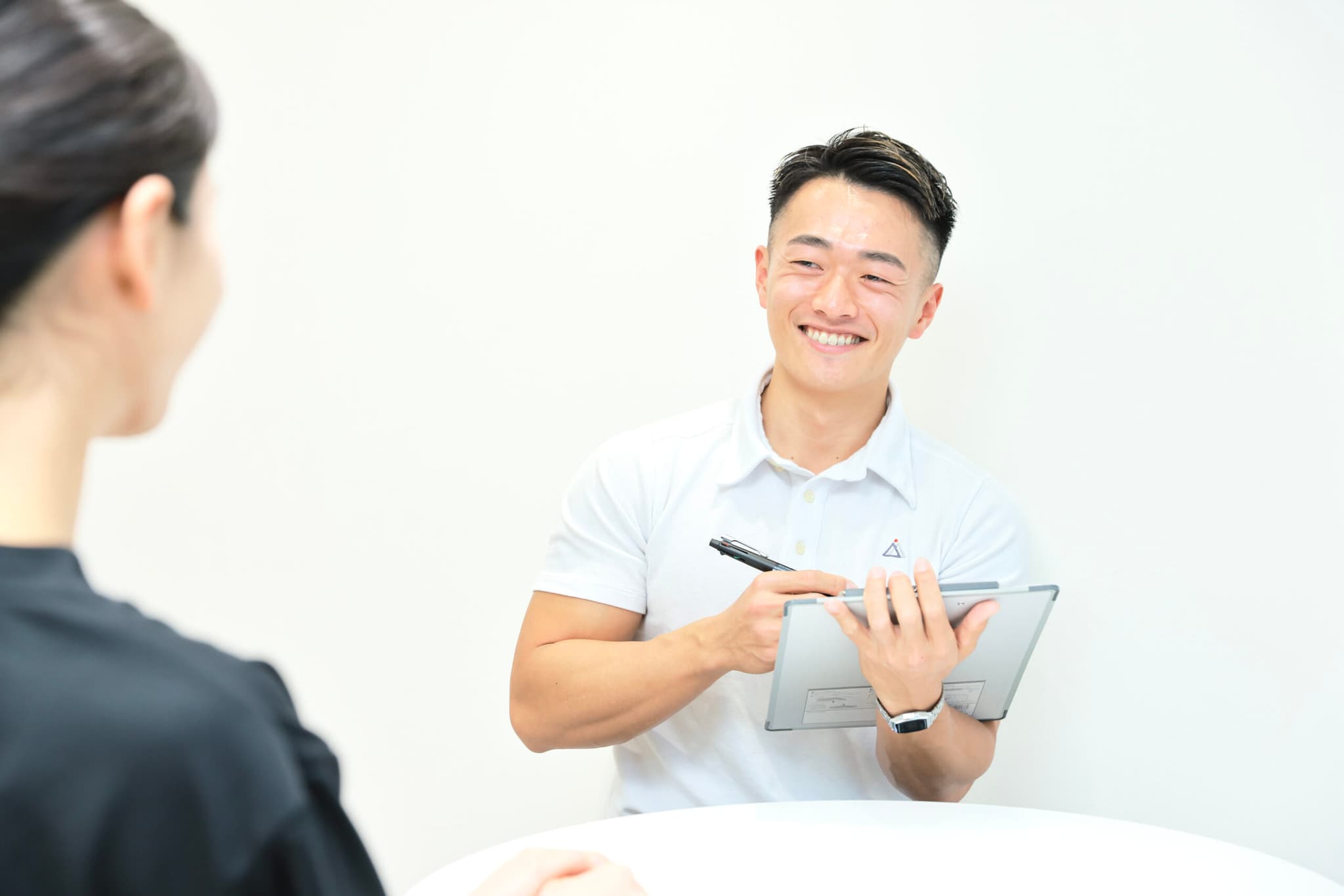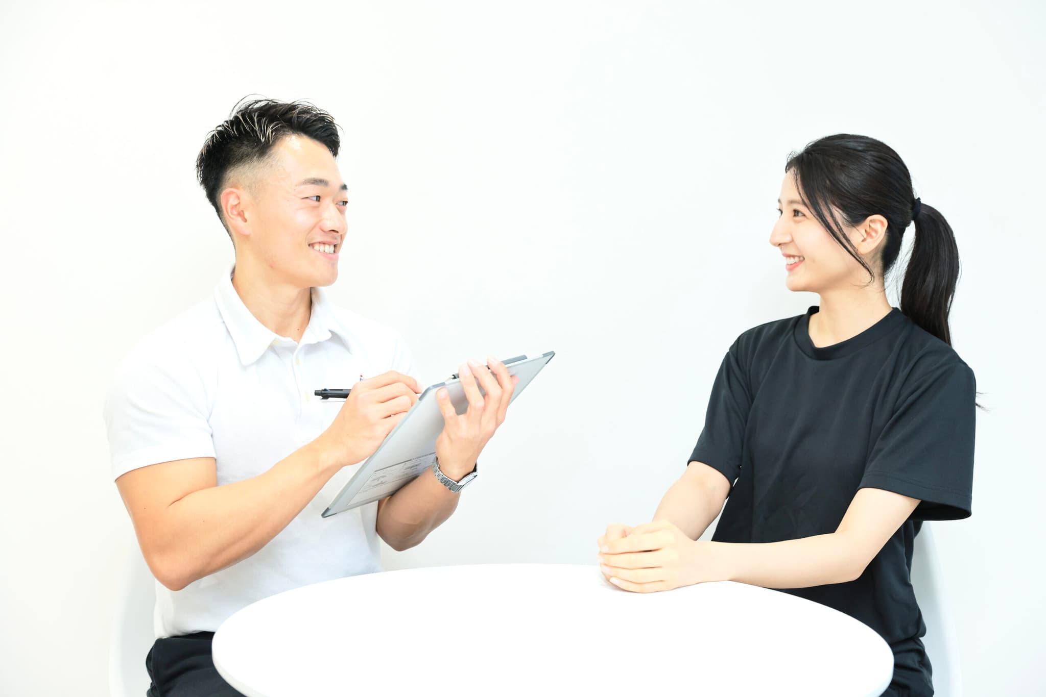 まずは体組成計で体脂肪率・筋肉量をチェックしカウンセリングへ。身体で気になっている部位、どのような理想をもっているかなど、何でもご相談ください。