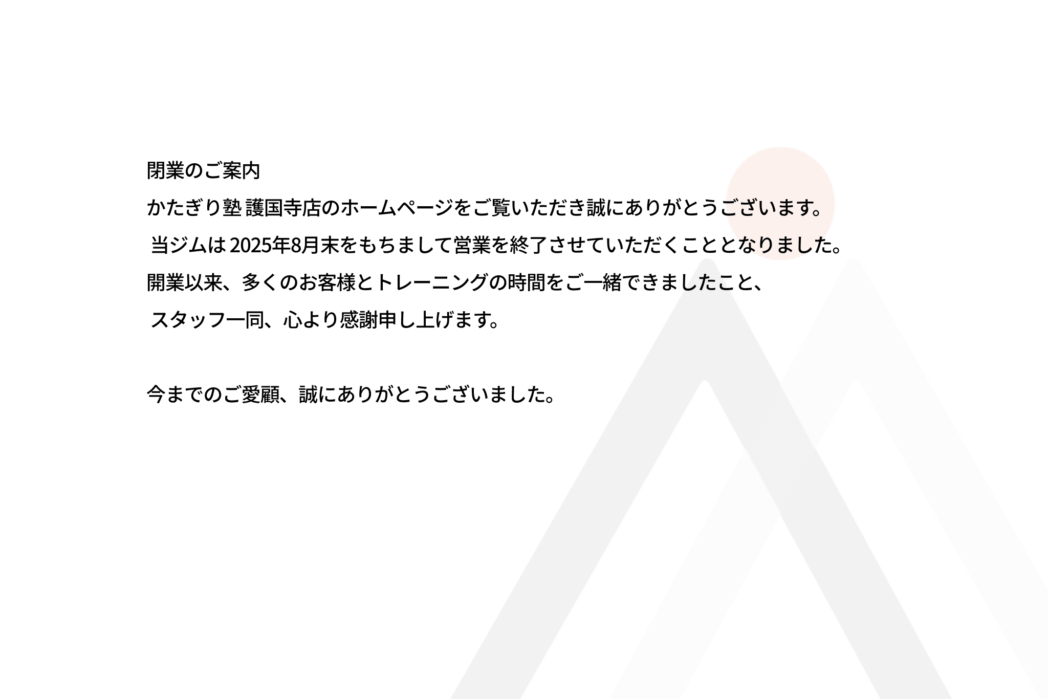 - 大丈夫です。かたぎり塾に通っているお客様の中には、初めて本格的なトレーニングを始められた方もたくさんいらっしゃいます。ご不安な場合は遠慮なくご相談ください。