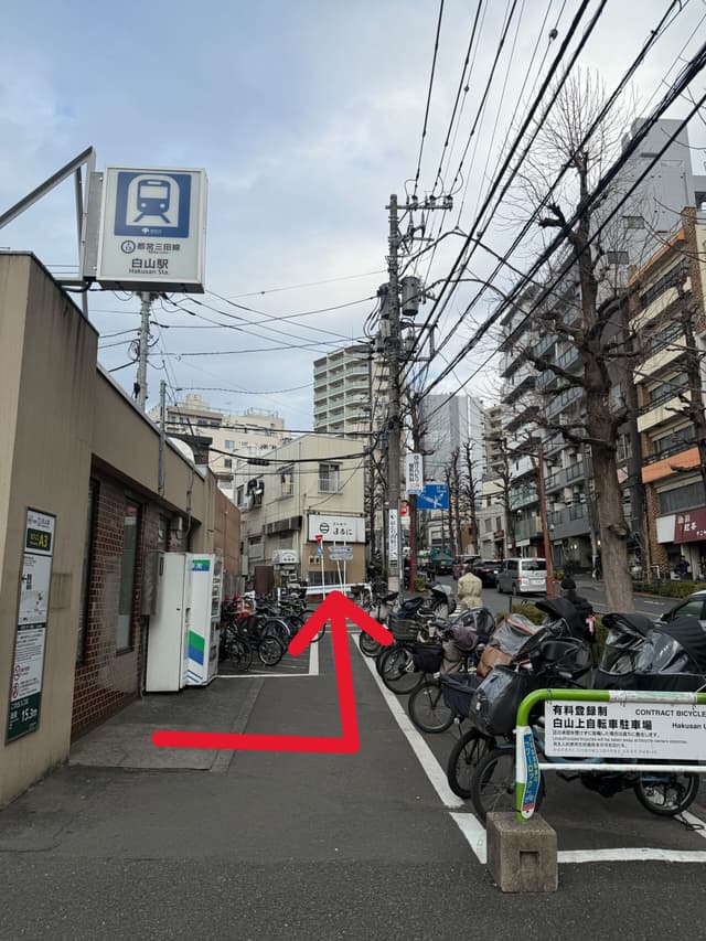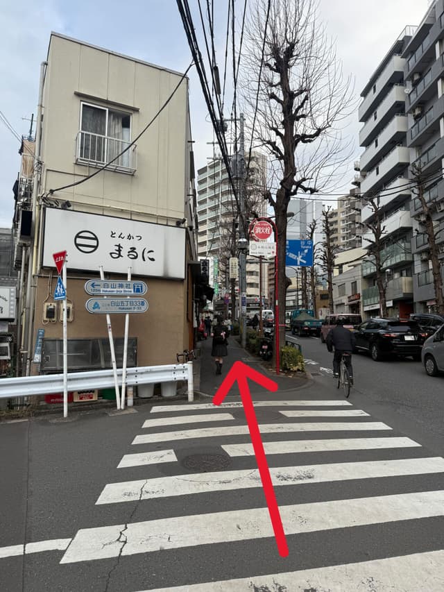 1都営三田線白山駅のA3出口を出たら『とんかつまるに様』を目標に直進します