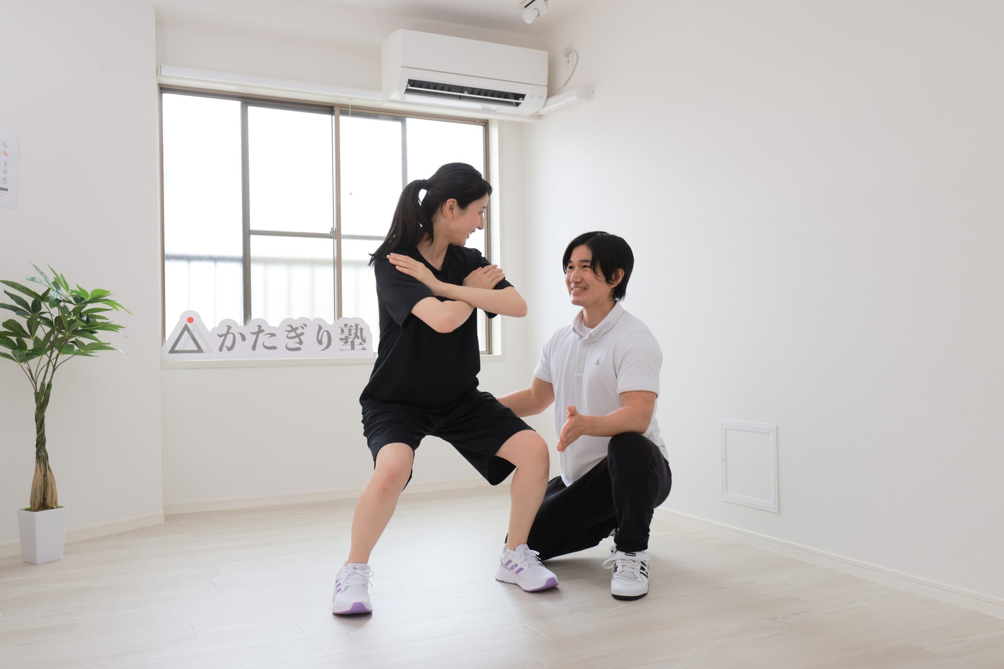 - 大丈夫です!かたぎり塾には、元々運動経験がない方も大勢通われています。お客様の身体や骨格の悩みに寄り添いながら、丁寧にトレーニング指導をさせていただきます。