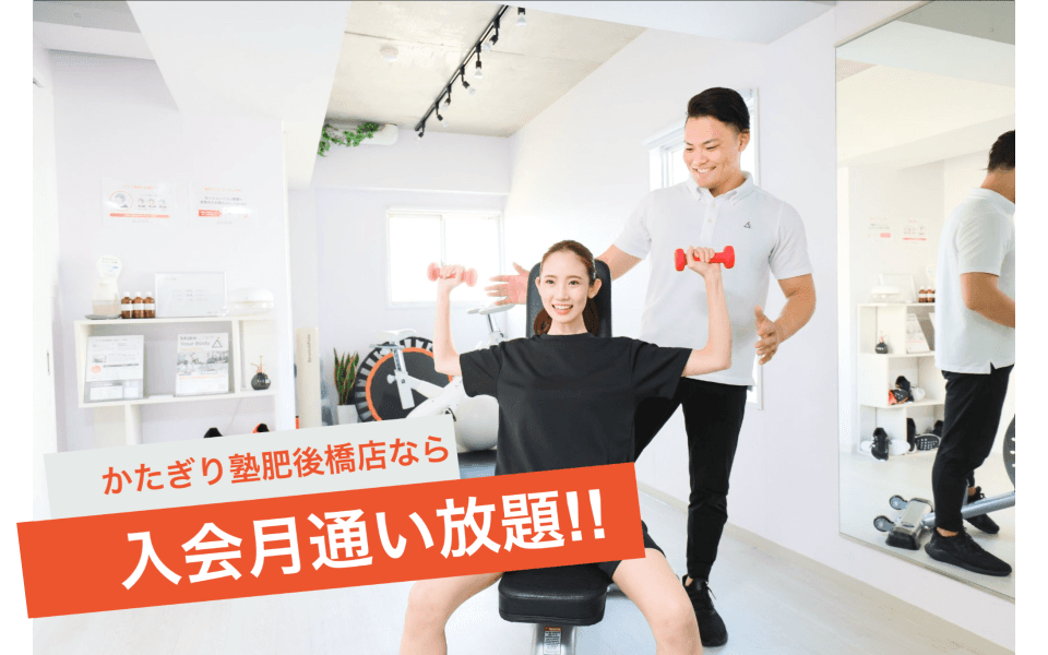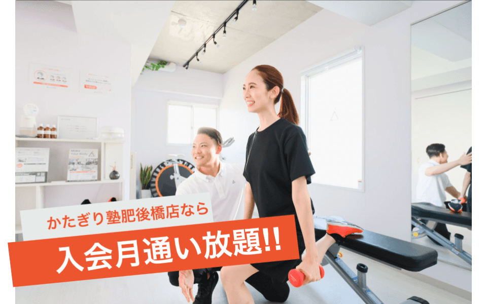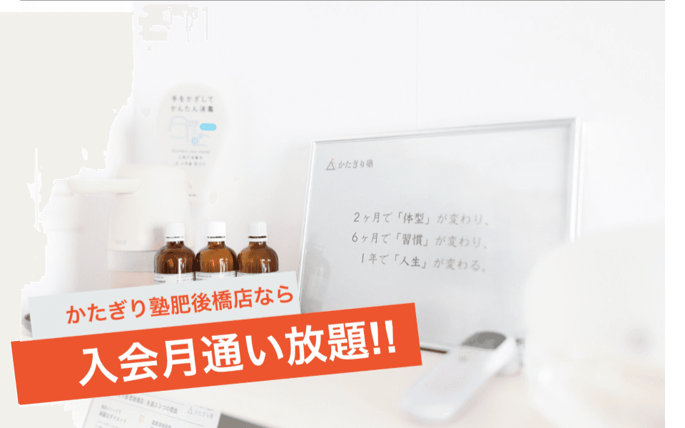 - かたぎり塾 肥後橋店では、あなたの理想を叶えるためのダイエット、ボディメイクをサポートさせていただきます。ぜひ無料体験にて、あなたの目標(いつまでに、どれくらい痩せたいか)を教えてください!