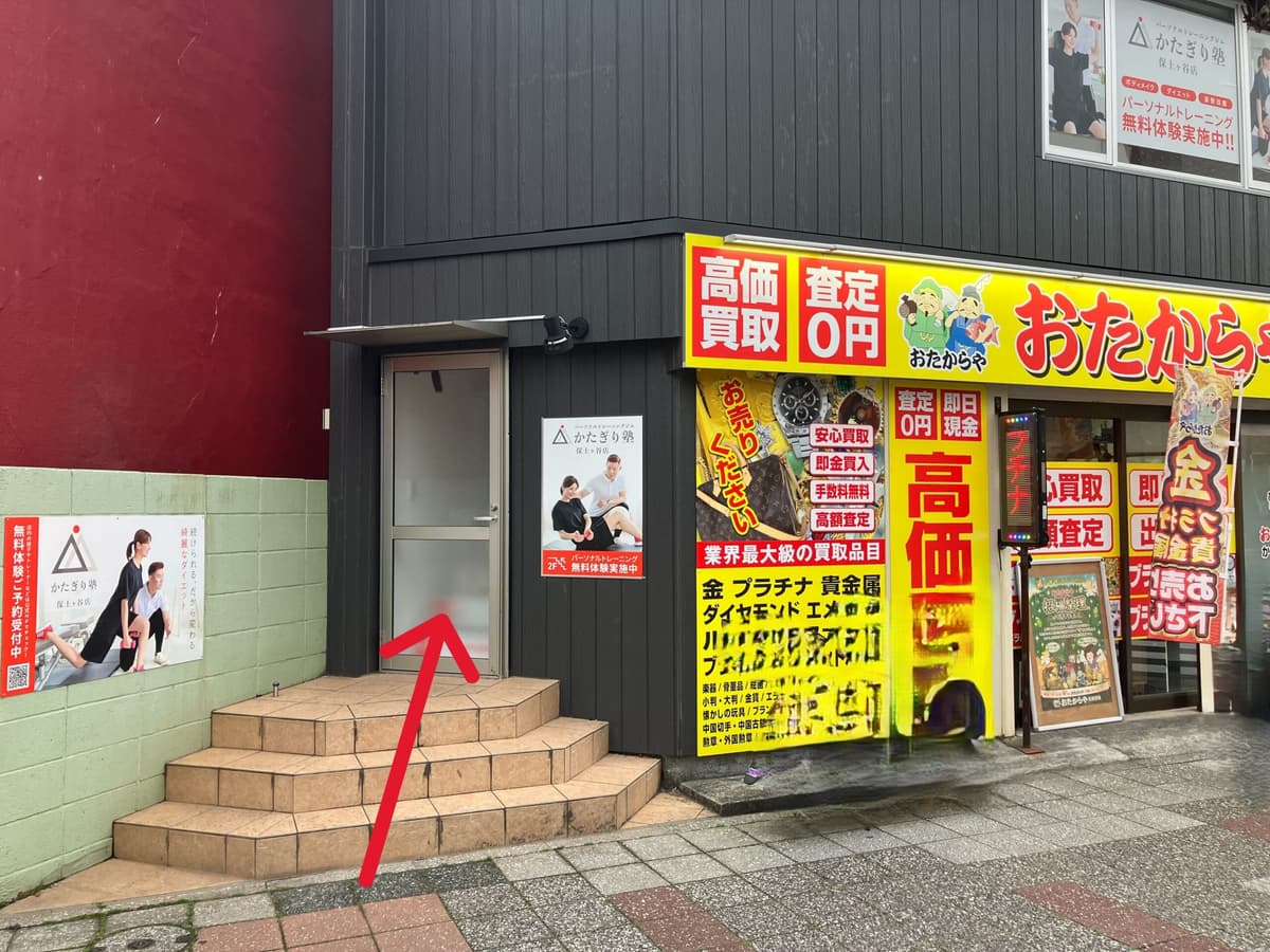 4「おたからや かたびら町店」が入っている、建物の2階になります。 階段からお上がりください。