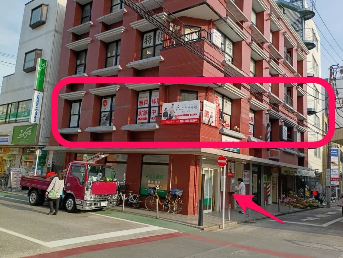 5正面レンガ調の建物の二階にかたぎり塾金沢文庫店がございます! 一階の階段から上がってお入りください!