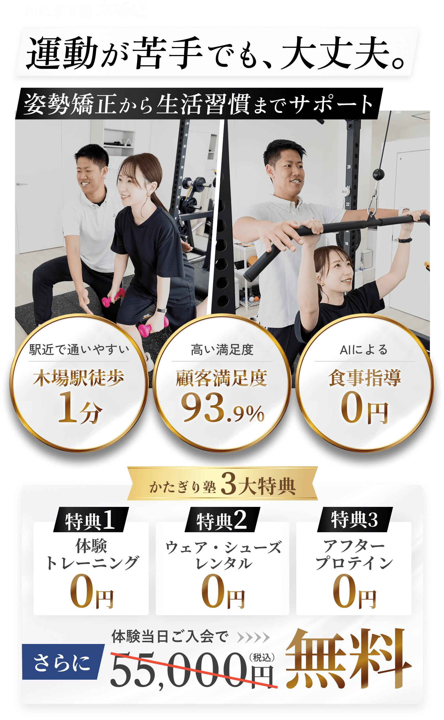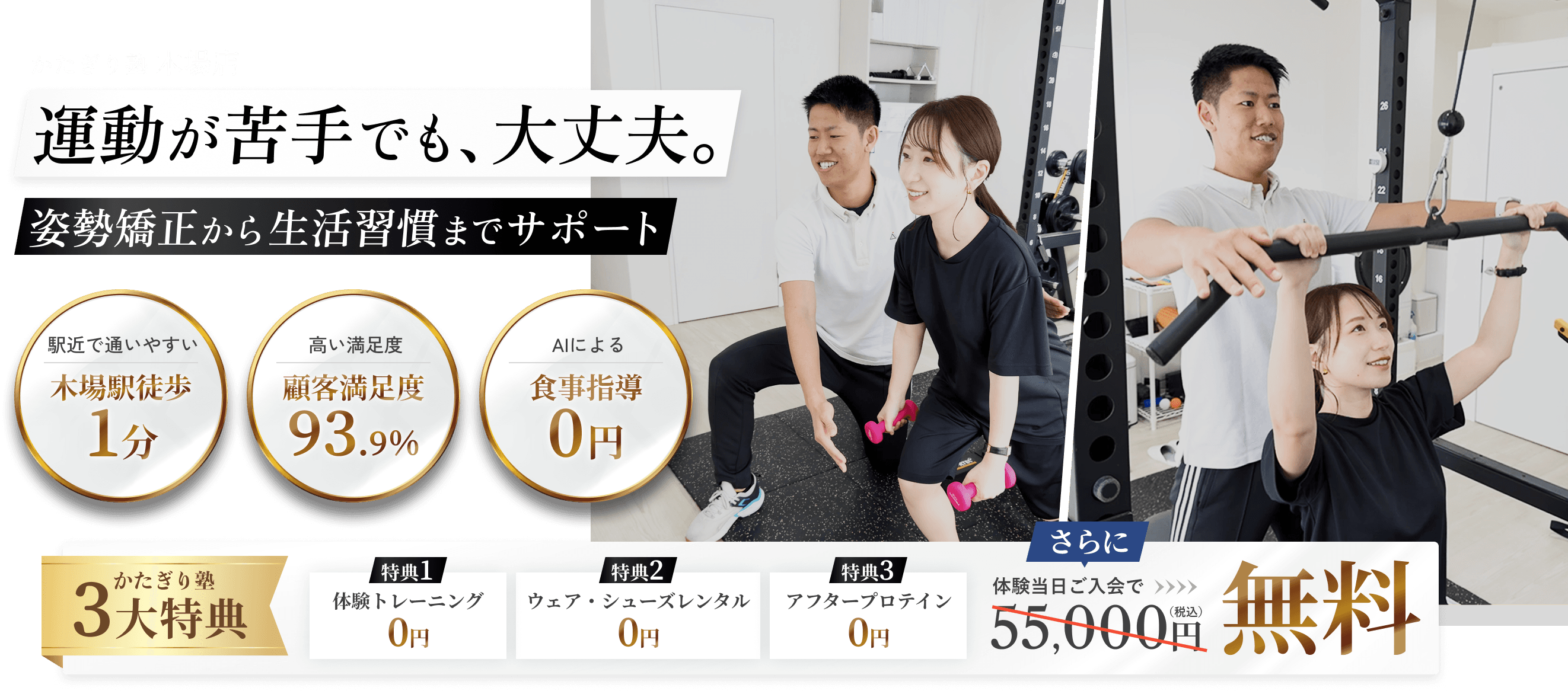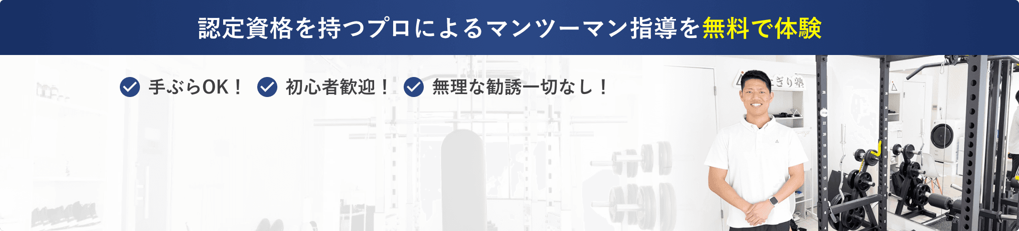 木場店では、トレーナーとの相性や、店舗の雰囲気・設備を実際に確かめていただきたいという想いから、体験レッスンを無料でご提供しています。