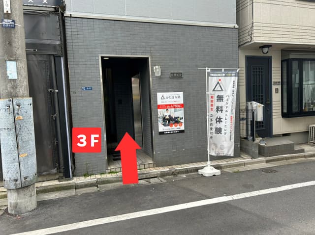 5ポスターが横に貼ってある入口から3階へ上がっていただくとかたぎり塾 菊川店へはいることができます。