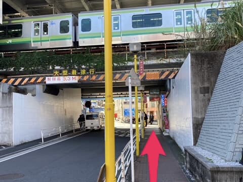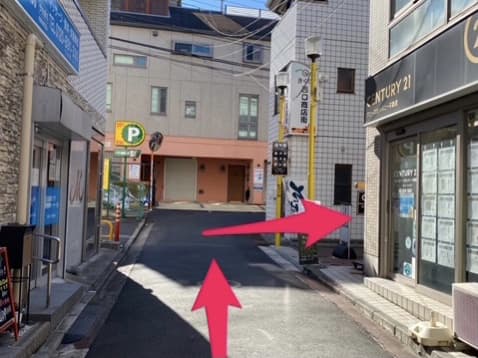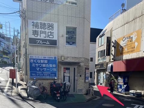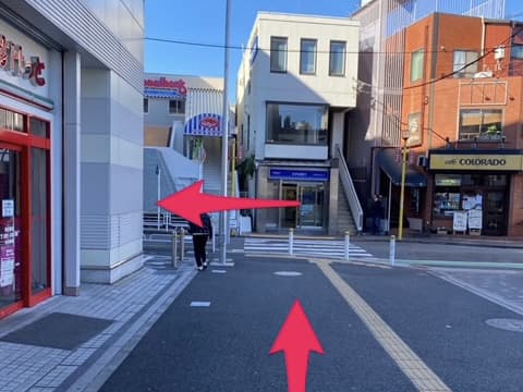 - 7到着!左手に見えてくる黄色い建物の1Fが当店です