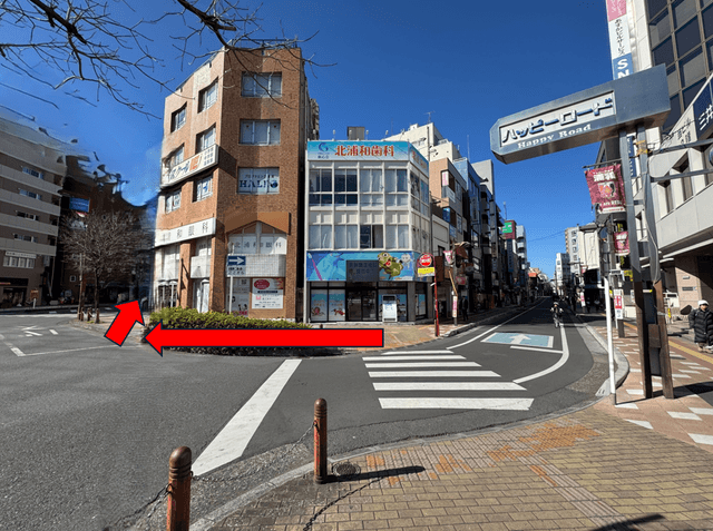 2直進ののち、【北浦和眼科】様に突き当ります。 道なりに左手へお進みいただき、北浦和眼科 様の前をお進み下さい。