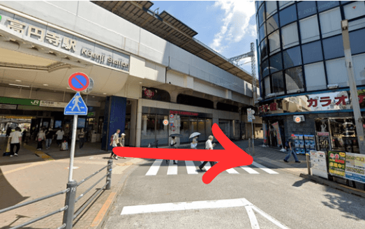 1高円寺駅南口を出て横断歩道を渡り、カラオケ館高円寺南口駅前店を直進します。