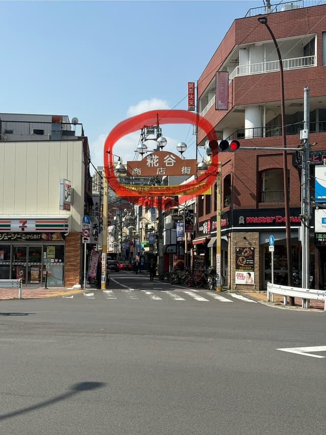 5100mほど直進すると赤丸で囲んでいる「糀谷商店街」の看板が大きくありますので商店街に入り直進します。