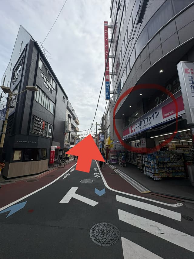 4突き当たりに「ココカラファイン糀谷駅前店」が見えてきますのでそれを右に曲がり矢印の方向に進みます。