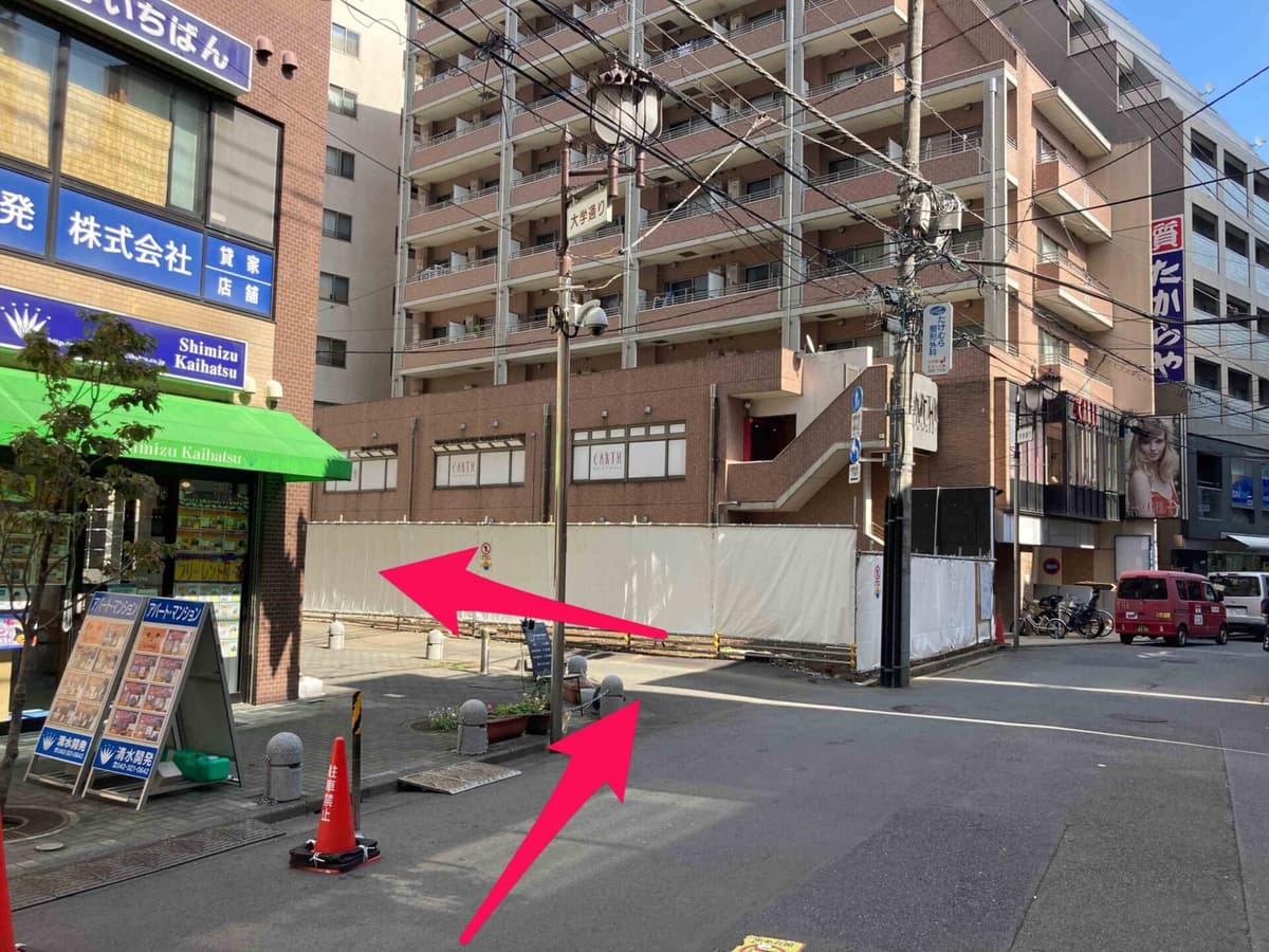 2マクドナルド手前を右手に曲がり、突き当りまで直進します。