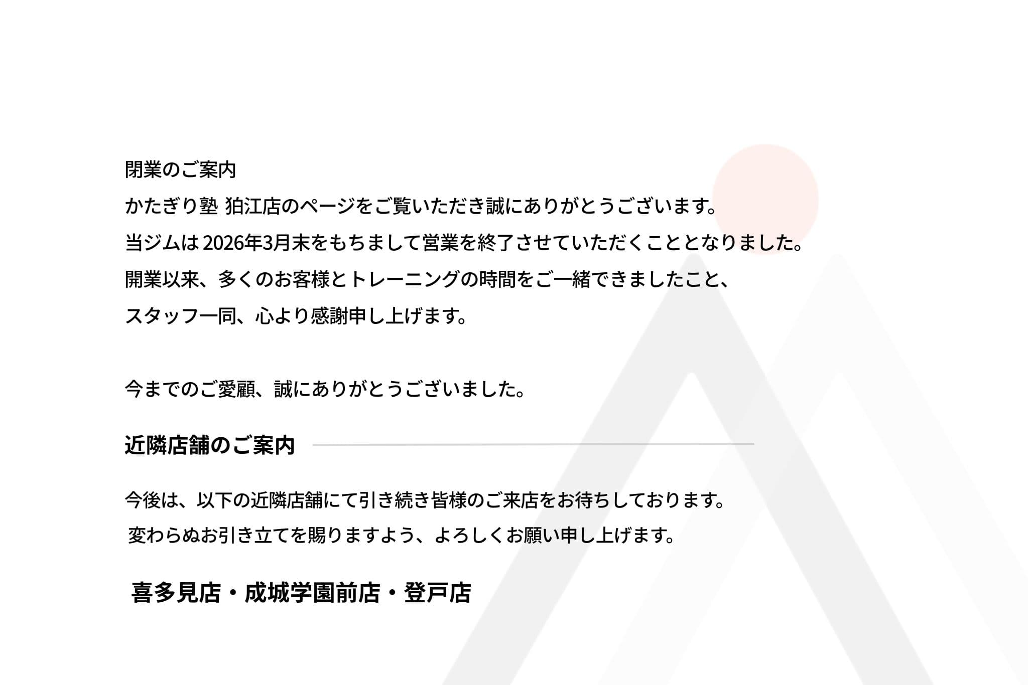 - ※体験トレーニングは原則おひとり様1回となりますが、場合によっては2回目以降の体験トレーニングを受け付ける場合がございます。
