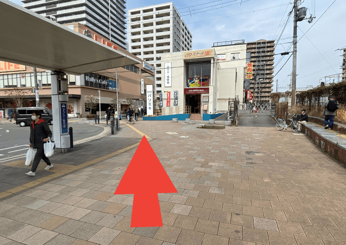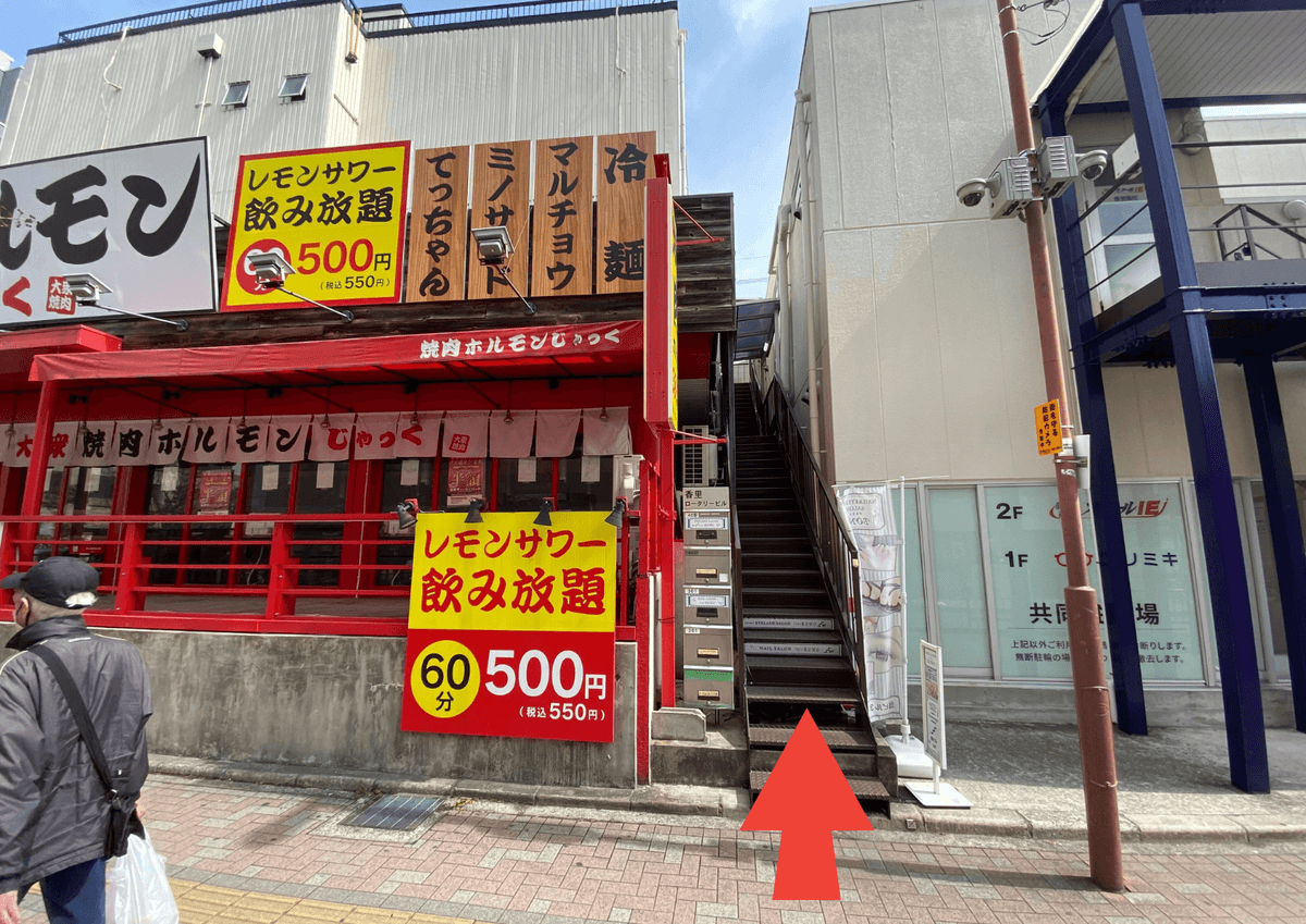 3パリミキ 香里店様を通過し、焼肉ホルモン じゃっく香里園店様の横の階段を上がってご来店ください