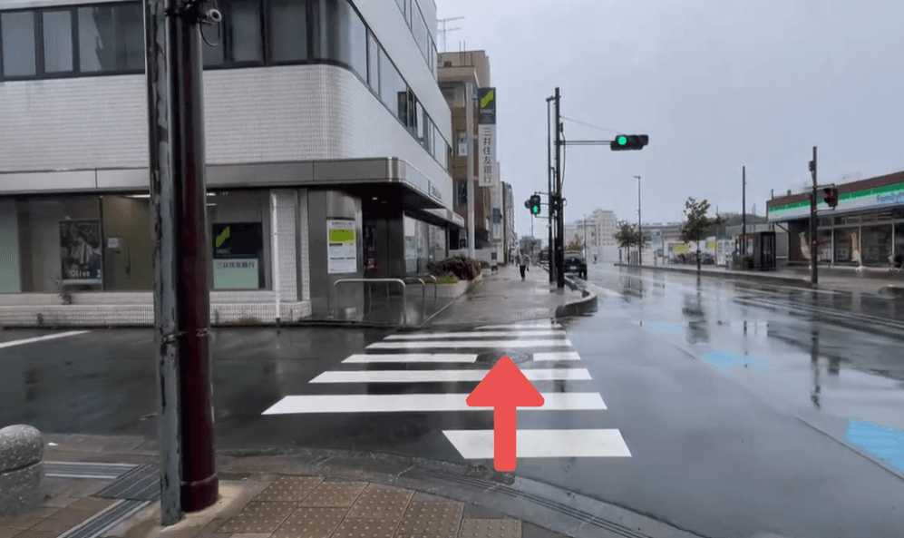 6しばらく直進しますと目の前に見える信号を渡り、『三井住友銀行』を目印に更に直進します。