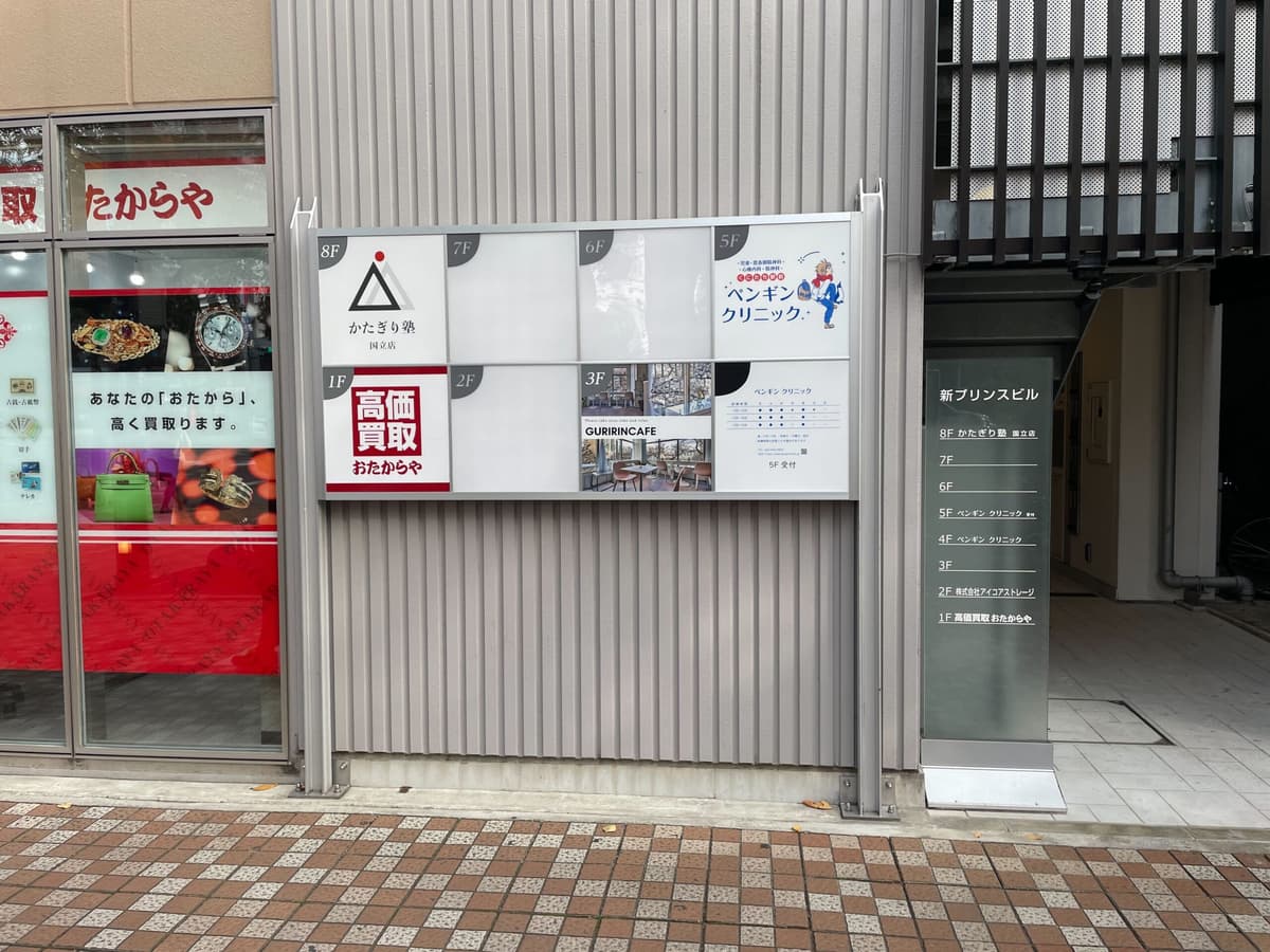 5新プリンスビル8階にかたぎり塾国立店があります。エレベーターへ8階へ起こしください!