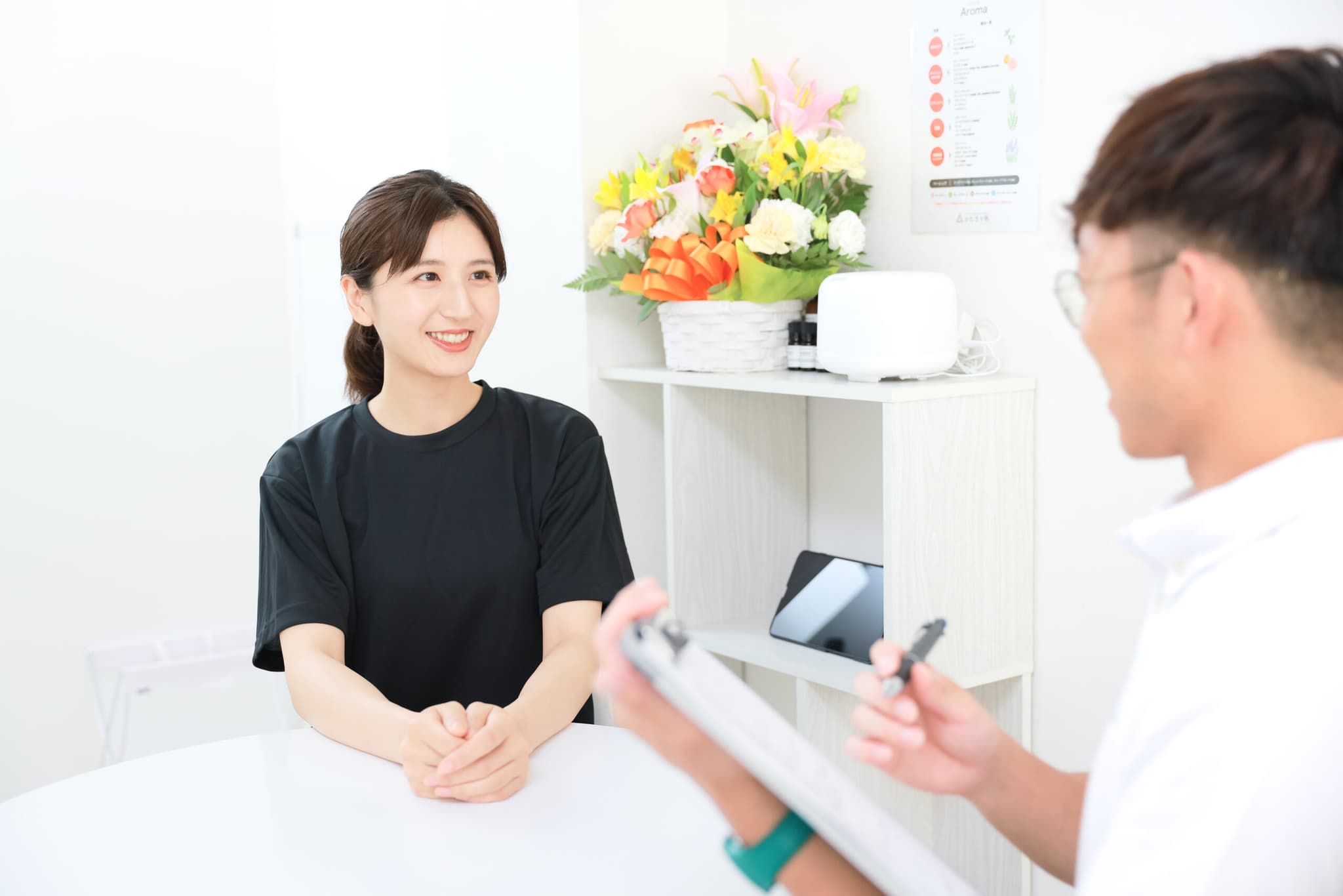 まずは体組成計で体脂肪率・筋肉量をチェックしカウンセリングへ。身体で気になっている部位、どのような理想をもっているかなど、何でもご相談ください。