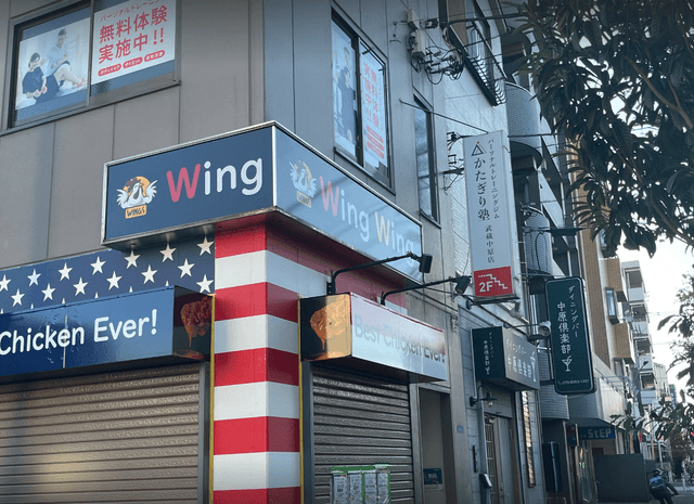 4しばらく進むと「WingWingWing」というチキン屋さんが見えてきます。その建物の2階にあるのが「かたぎり塾 武蔵中原店」です。