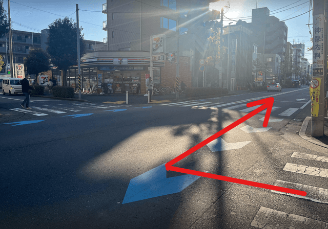 3「ファミリーマート武蔵中原駅前店」と「セブンイレブン武蔵中原駅前店」のある交差点を右折し、そのまましばらく直進します。