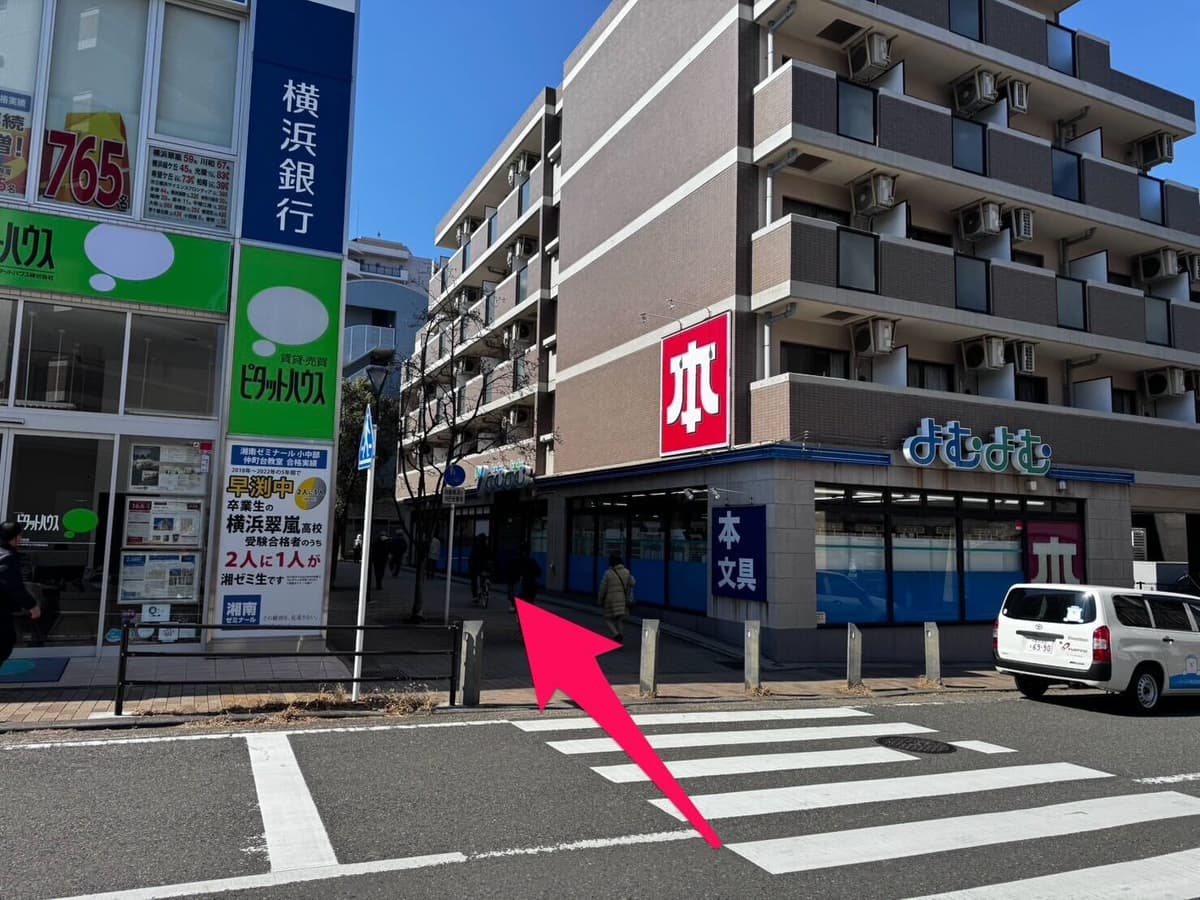 4横断歩道を渡り、本屋「よむよむ 横浜仲町台店」を左手に脇道に入ります