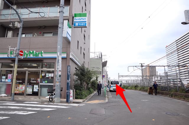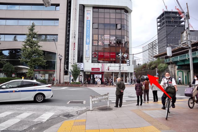 3横断歩道を渡り、高架とビルの間の道へ入ります。