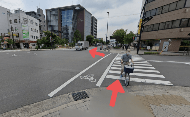 2ロータリーから直進したら交差点を矢印の通りに信号を渡ります。