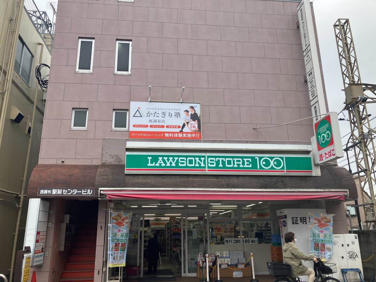 2北口、すぐ目の前に見える『ローソンストア100 西調布駅前店』と同じ建物の『西調布駅前センタービル 2階-A号室』が『かたぎり塾 西調布店』となっております。 ご来店お待ちしております。