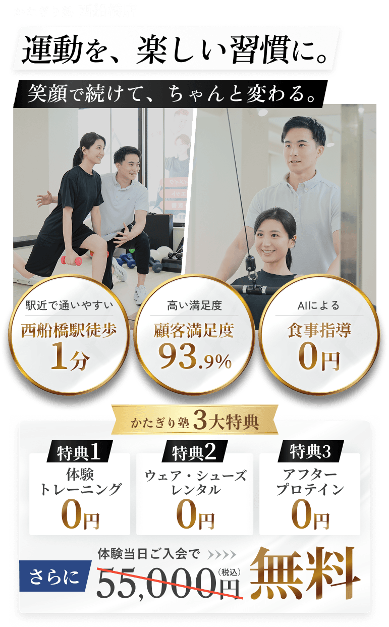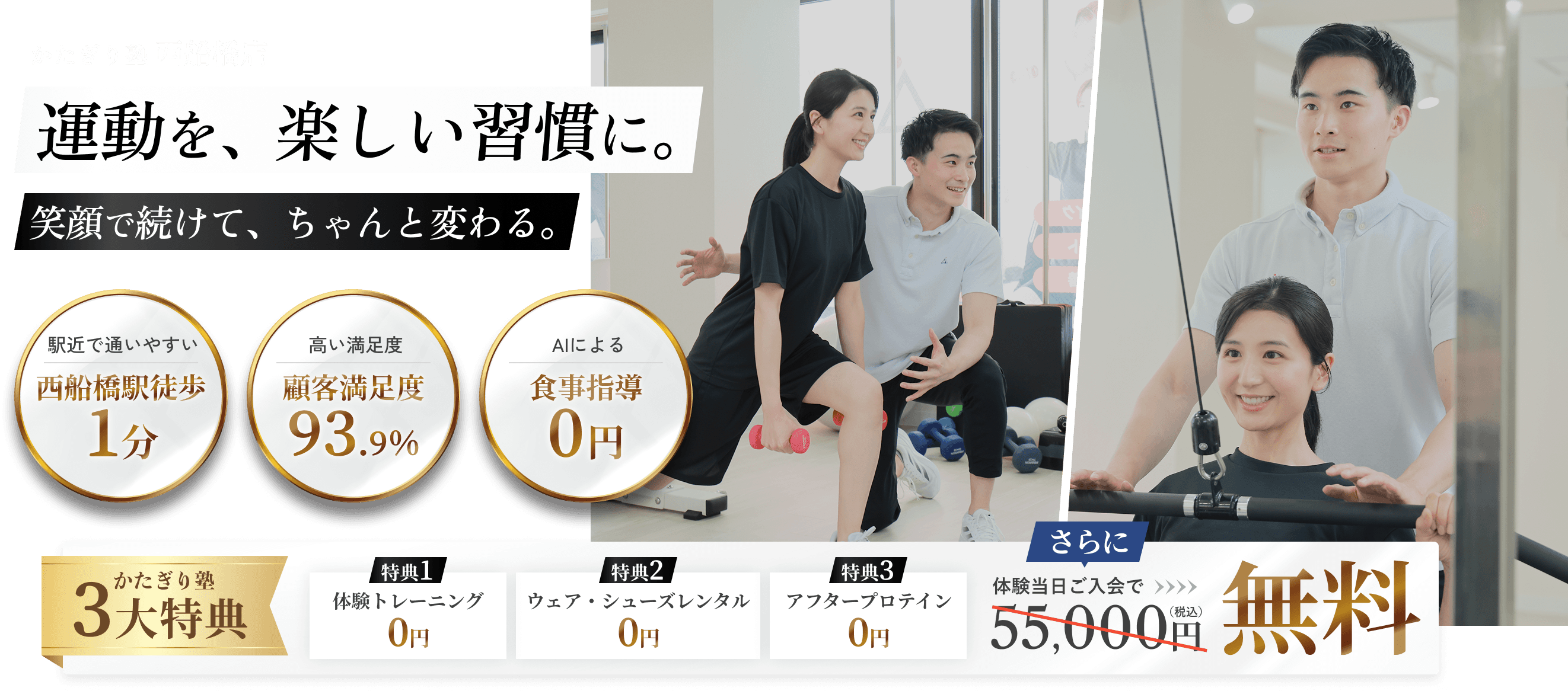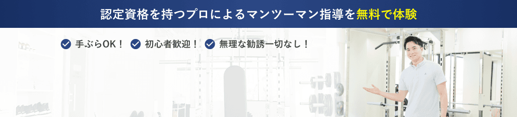 西船橋店では、トレーナーとの相性や、店舗の雰囲気・設備を実際に確かめていただきたいという想いから、体験レッスンを無料でご提供しています。