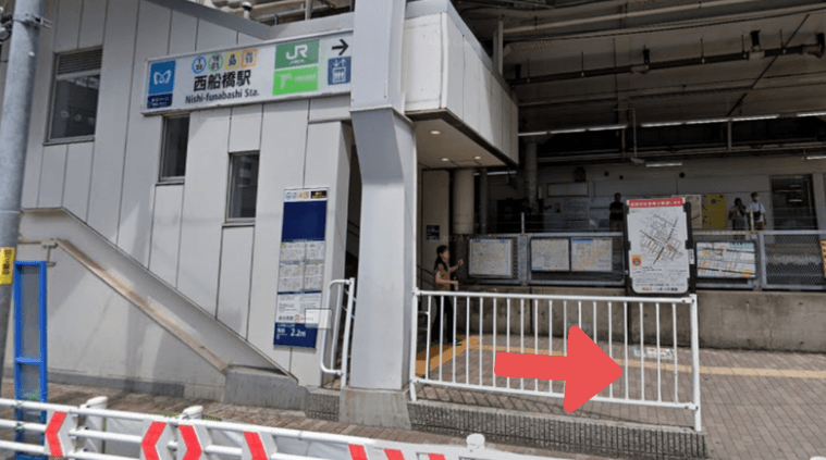 1JR総武線・京葉線・武蔵野線・東京メトロ東西線・東葉高速鉄道 西船橋駅 南口側でぐちを出て左へ直進します。