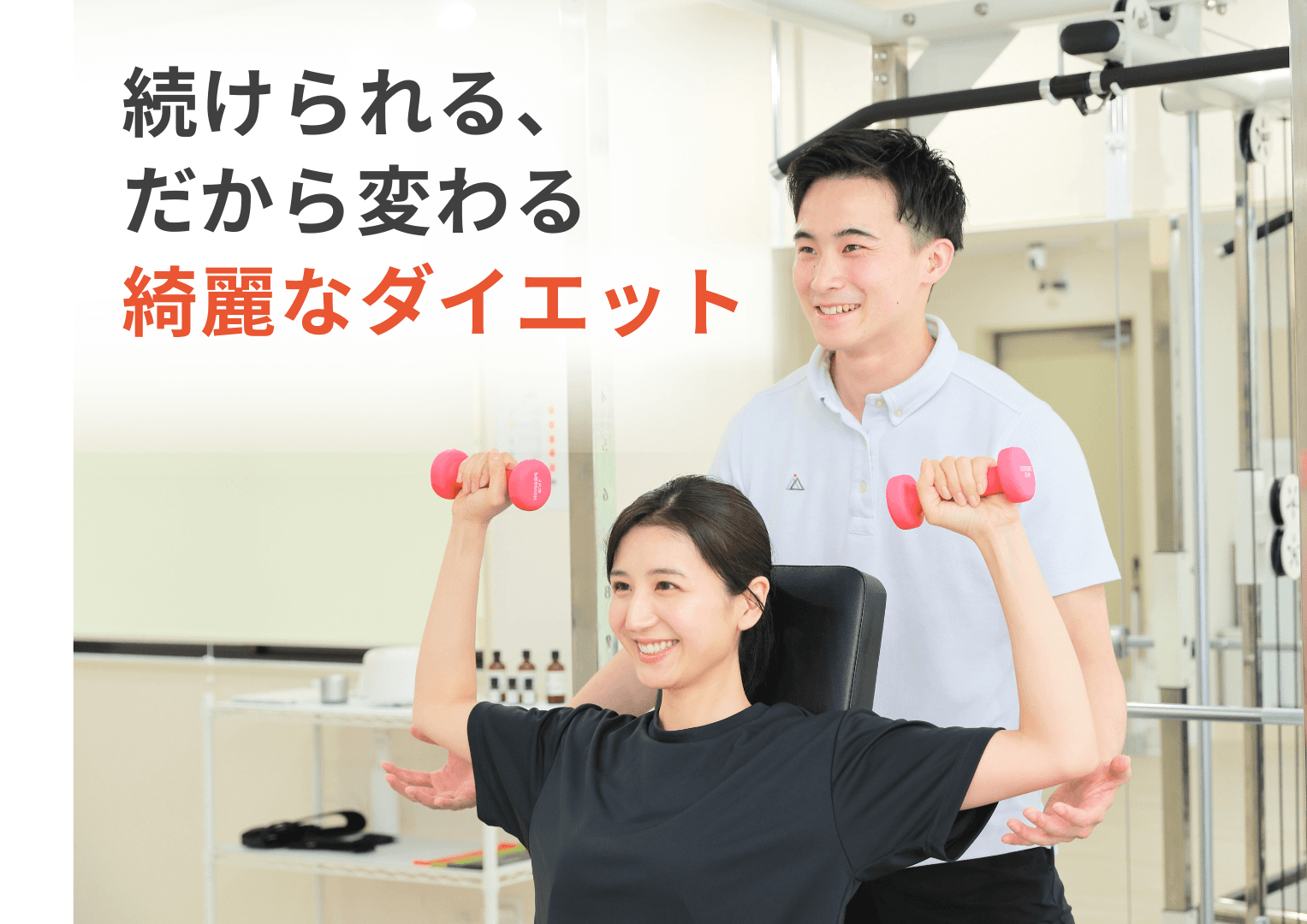 トレーニングによって正しい体の使い方と運動習慣を身につけ、食事サポートと良質な睡眠によって食欲を整える、自然に体が引き締まっていく生活習慣づくりをお手伝いしています。