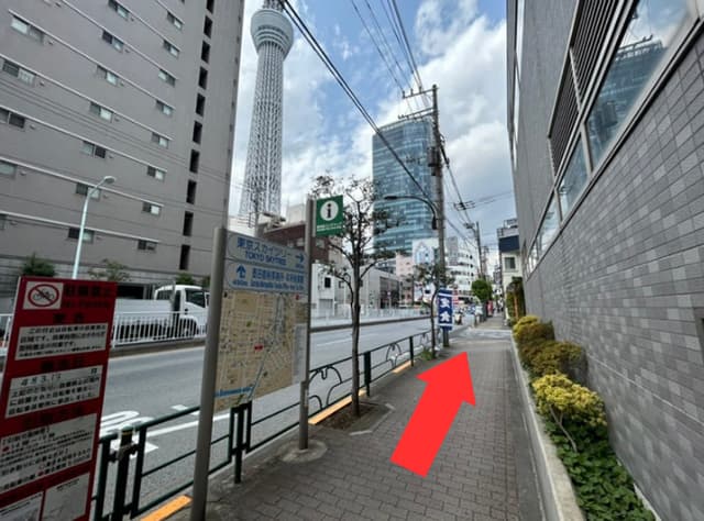 2押上駅B1出口を出てすぐ右に東京スカイツリーが見えますので、スカイツリーの方へ直進します。