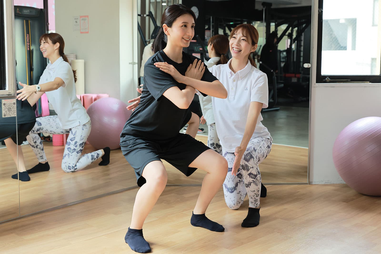 - 大丈夫です!かたぎり塾には、運動経験がない方も大勢通われています。女性トレーナーが、女性特有の身体や骨格の悩みに寄り添いながら、丁寧にトレーニング指導をさせていただきます。