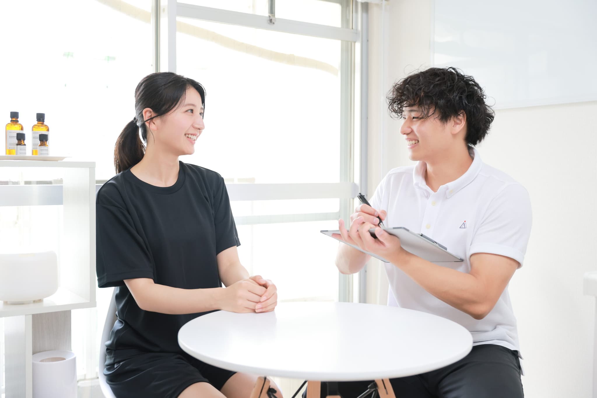 まずは体組成計で体脂肪率・筋肉量をチェックしカウンセリングへ。身体で気になっている部位、どのような理想をもっているかなど、何でもご相談ください。