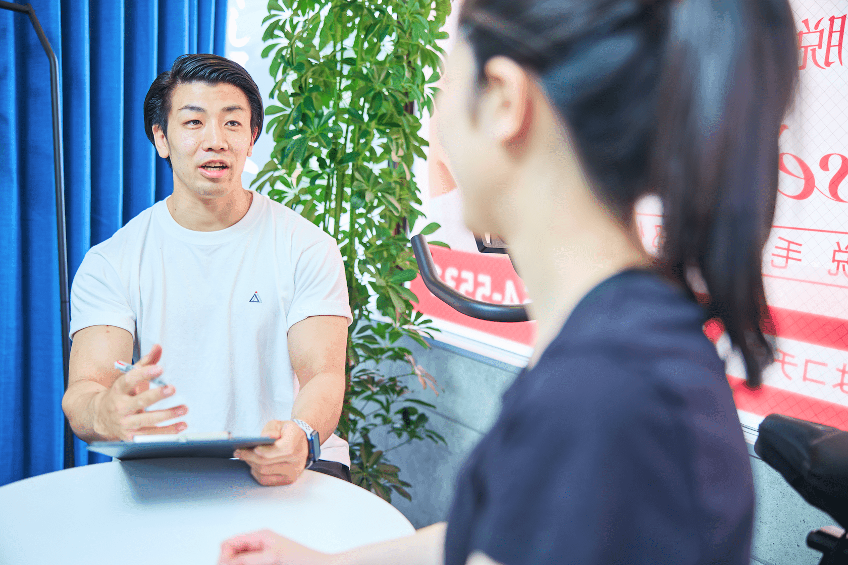 まずは体組成計で体脂肪率・筋肉量をチェックしカウンセリングへ。身体で気になっている部位、どのような理想をもっているかなど、何でもご相談ください。