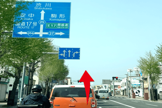 3本町1丁目を直進し、渋川街道/県道25号へ進みます。その後、住吉町交差点も直進です。