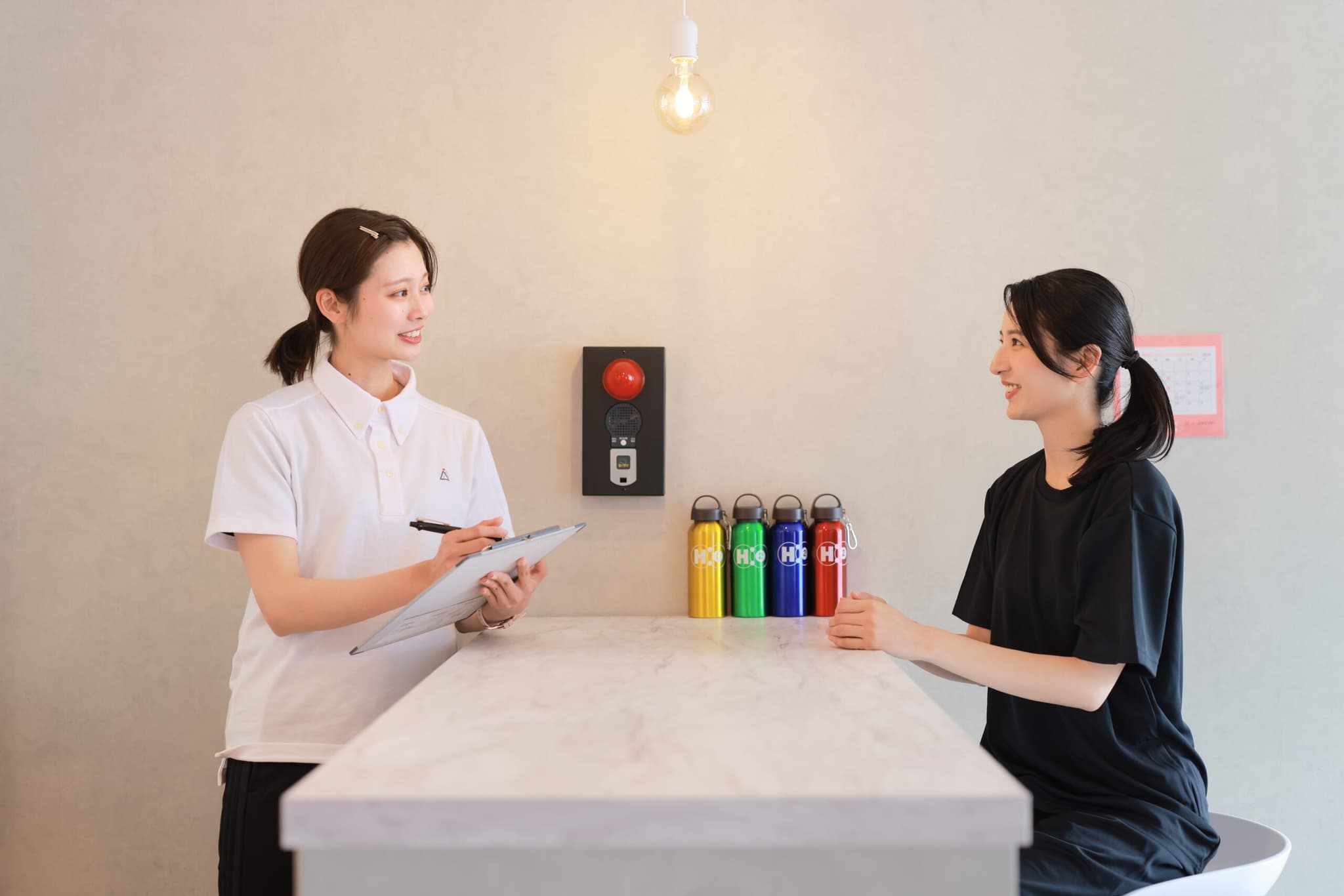 まずは体組成計で体脂肪率・筋肉量をチェックしカウンセリングへ。身体で気になっている部位、どのような理想をもっているかなど、何でもご相談ください。